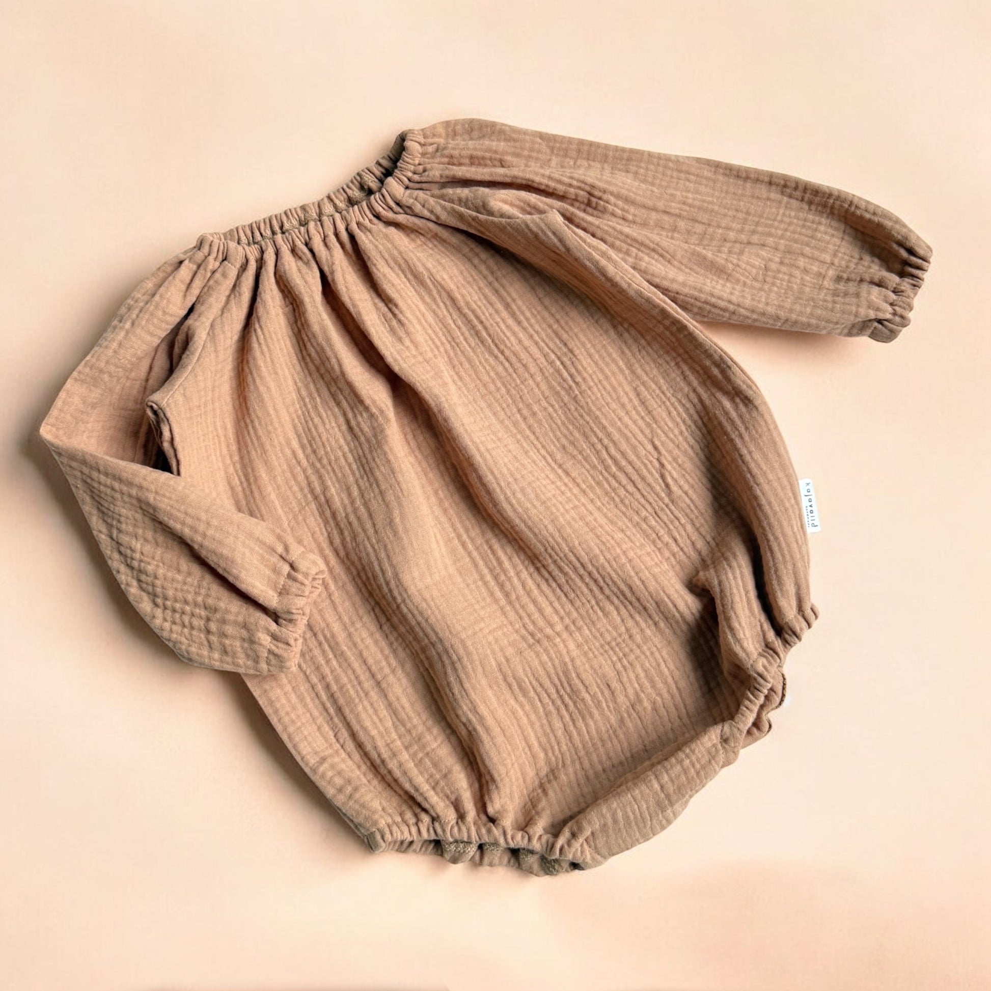 Suloinen romper vauvalle, saatavilla kevyestä ja pehmeästä harsokankaasta tai ekologisesta pellavasta. Romperissa on väljä mitoitus, pitkät hihat ja vaipanvaihtoa helpottavat nepparit haarassa. Pääntiellä, lahkeissa ja hihansuissa on pehmeä kuminauha.