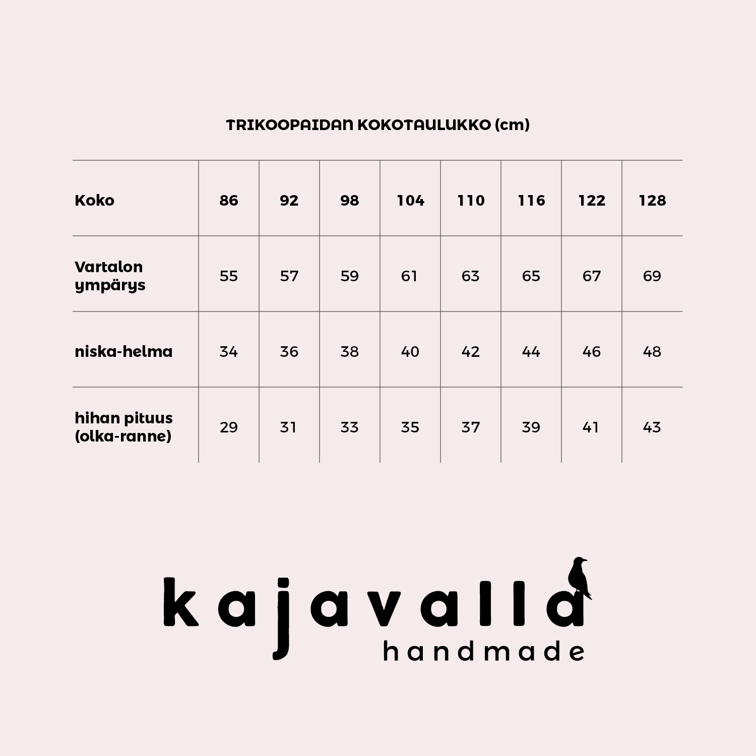 Paita ommellaan laadukkaasta ja pehmeästä trikoosta. 95% puuvilla, 5% elastaani.