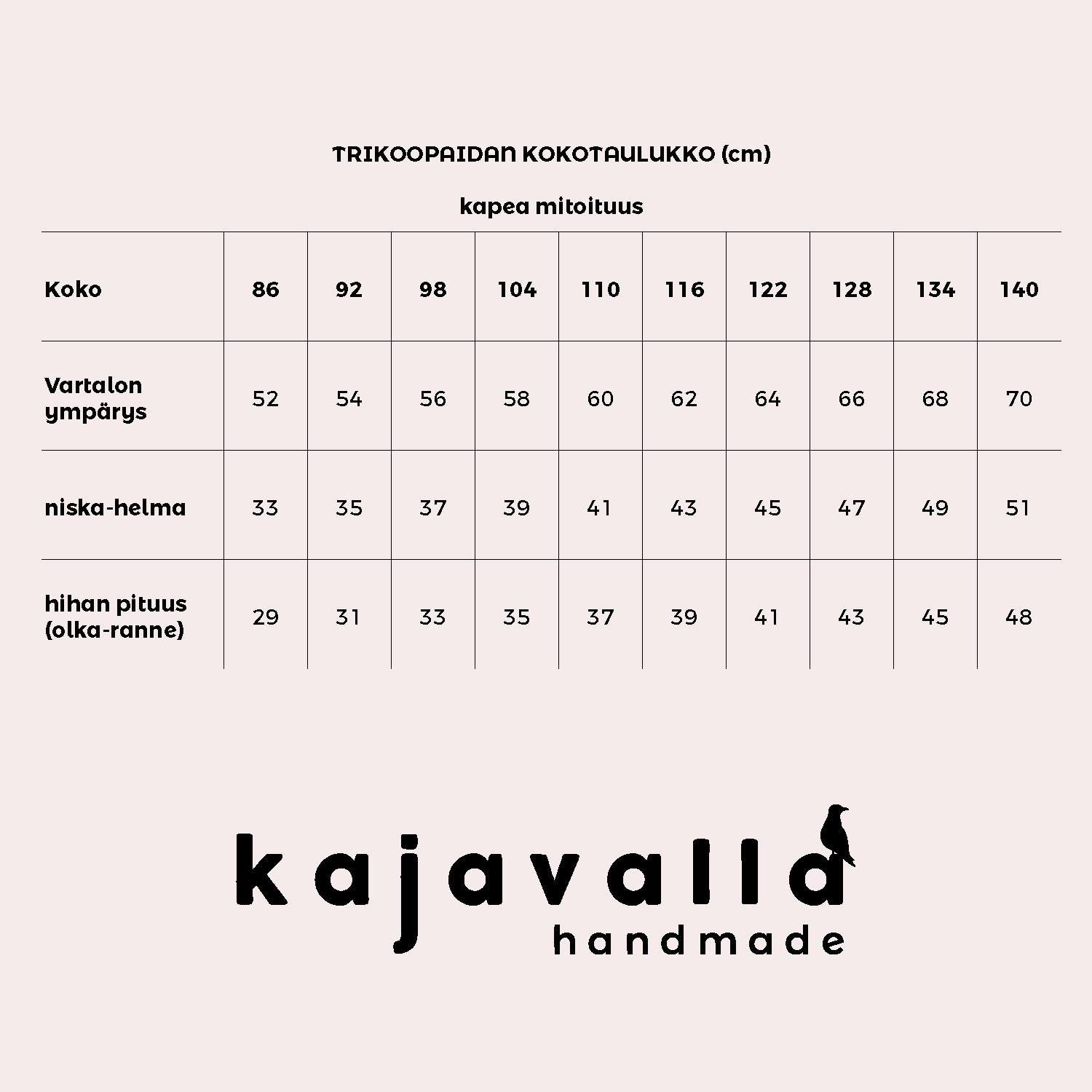 Pehmeä ja joustava pitkähihainen trikoopaita on mukava arjen luottovaate lapselle. Saatavilla useissa kuoseissa! Paita on saatavilla kahdella mitoituksella: normaali ja kapea. Tuotteen kuvista löytyy molempien mallien kokotaulukko. Sovituskuvissa n. 94cm pitkällä pojalla on päällä normaalimitoituksen paita koossa 98.