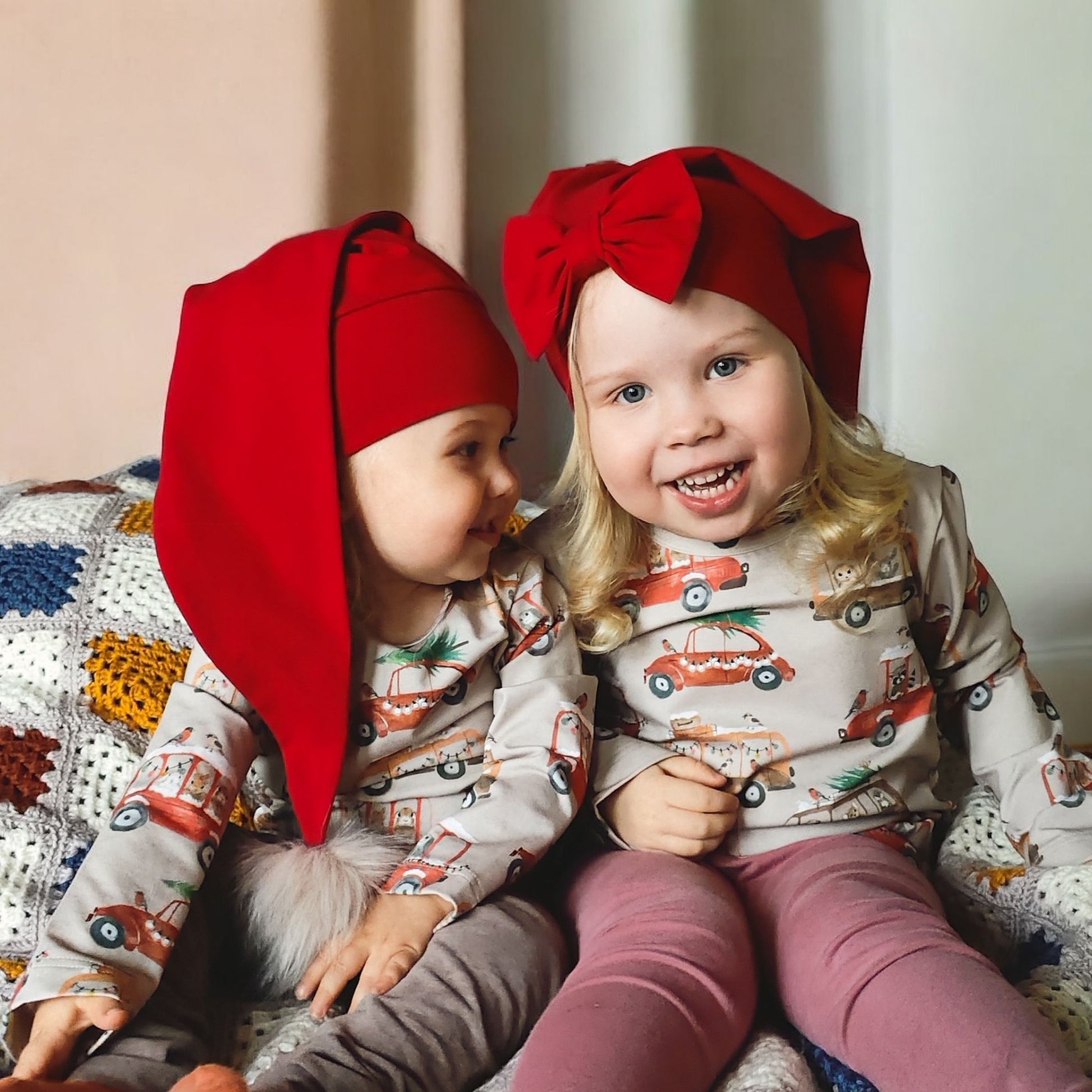 Suloinen tonttulakki keinokarvatupsulla. Valitse koko lapsen päänympäryksen mukaan.