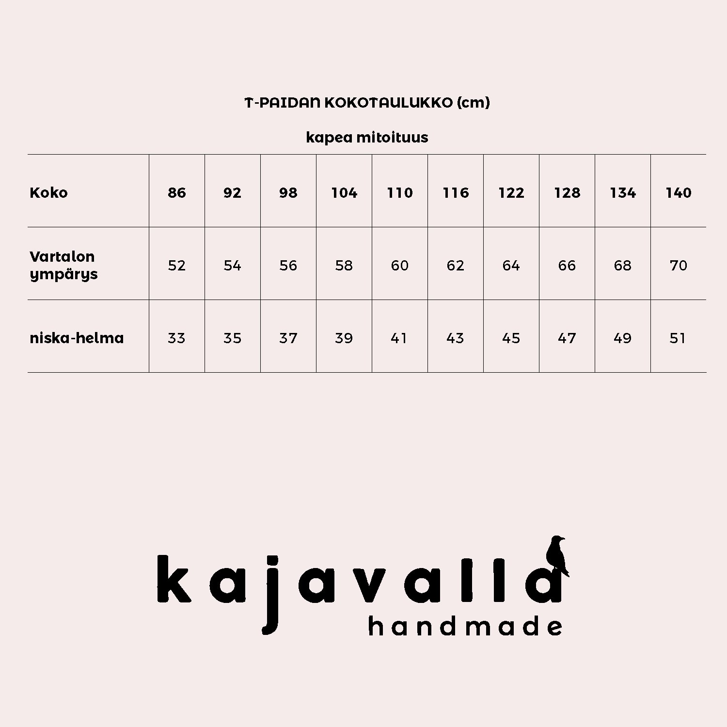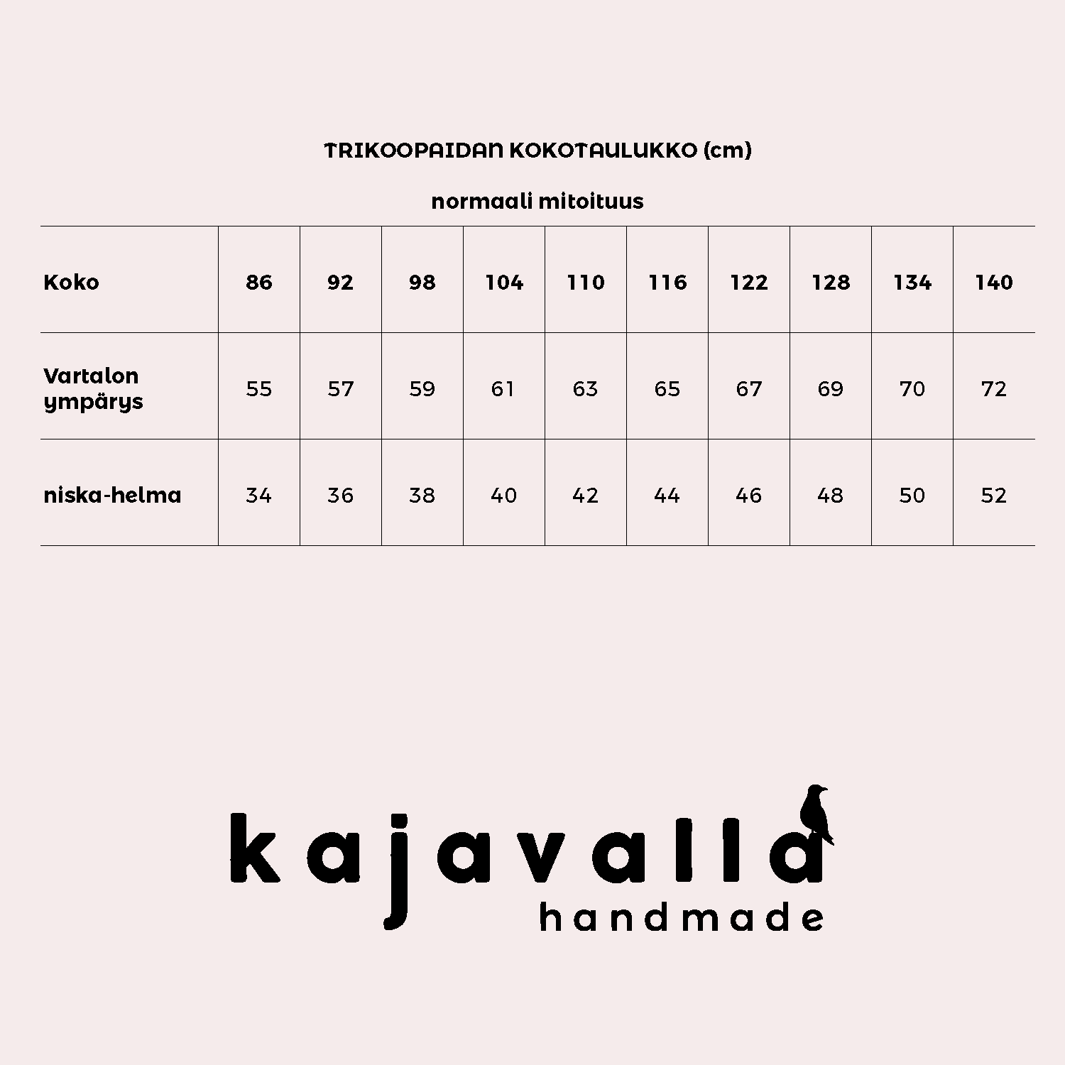 Paita on saatavilla kahdella mitoituksella: normaali ja kapea. Mittataulukot löytyvät tuotteen kuvista.