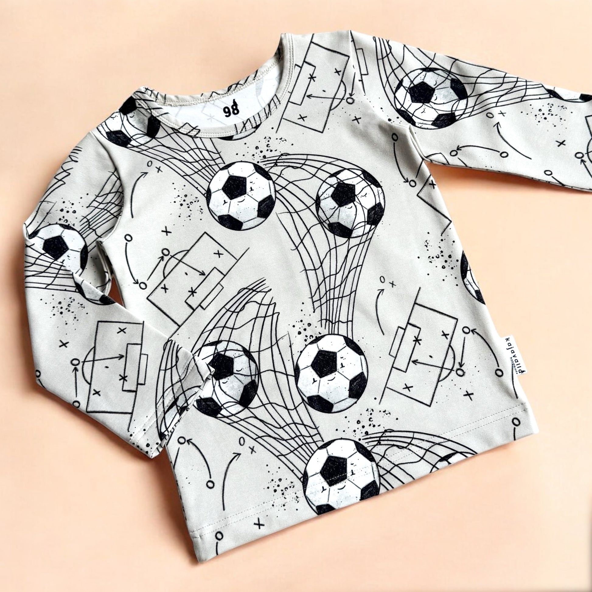 Laadukas ja napakka, sileäpintainen luomupuuvilla-elastaanitrikoo vauhdikkaalla jalkapallo-kuosilla.