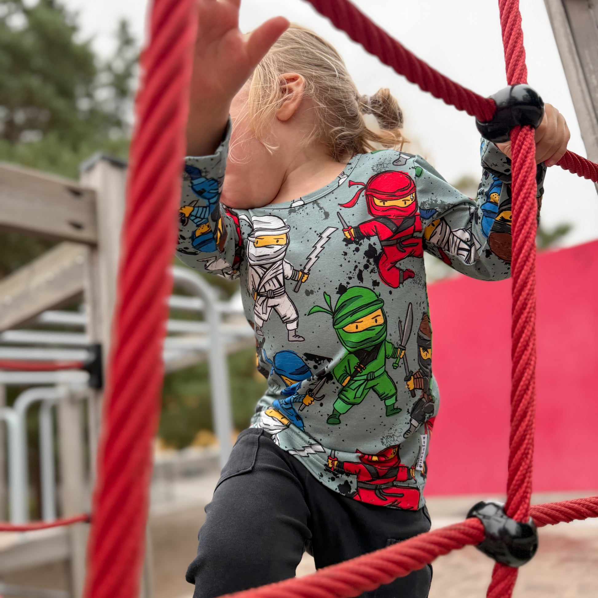 Laadukas ja napakka, sileäpintainen luomupuuvilla-elastaanitrikoo Ninjat-kuosilla. Vihreän ninjan korkeus on n. 13 cm.