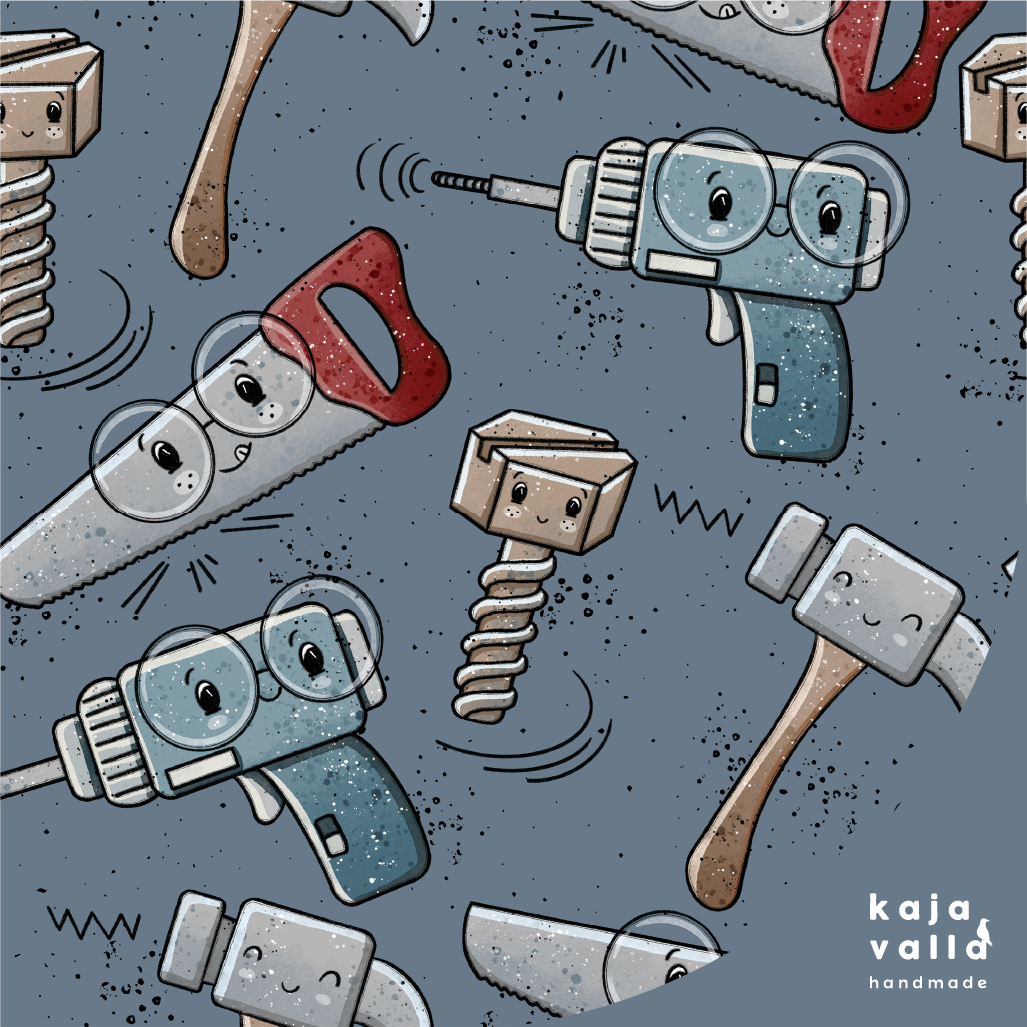 Laadukas ja napakka, sileäpintainen luomupuuvilla-elastaanitrikoo veikeällä työkalu-kuosilla. Vasaran korkeus on n. 10 cm.