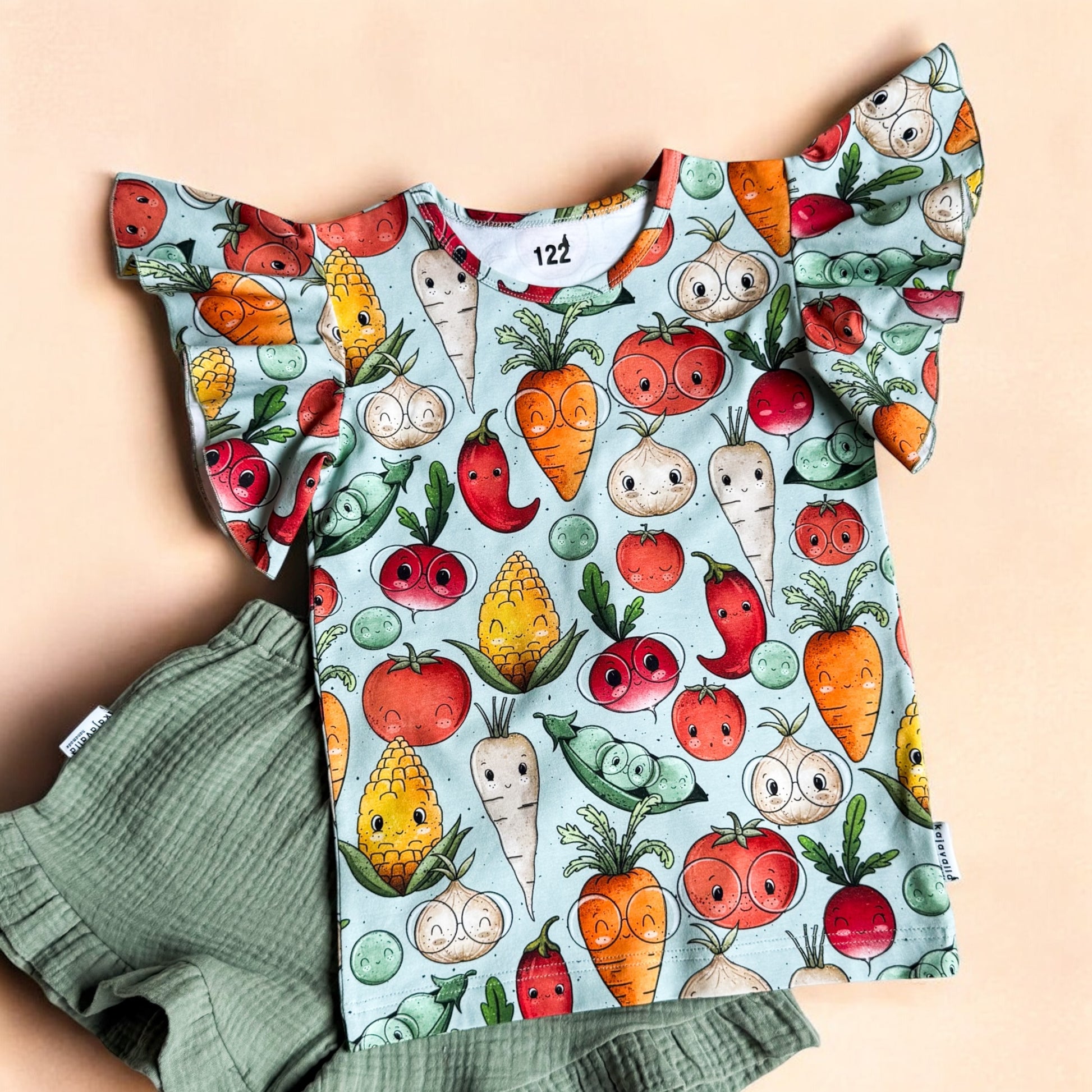 Puuvilla-elastaanitrikoo hauskalla Veggies -kuosilla.