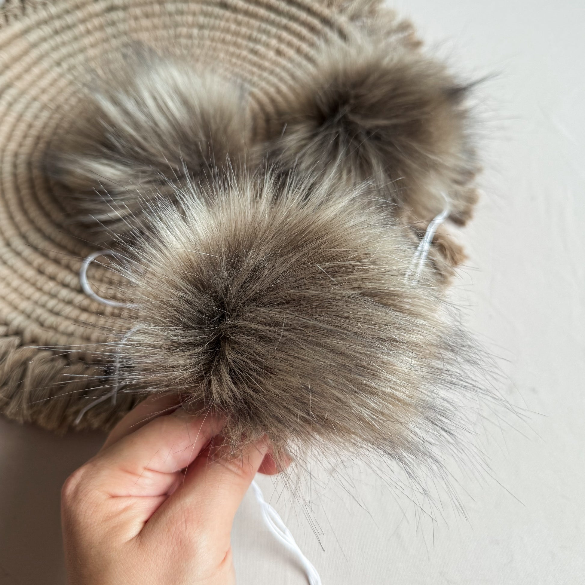 Muhkea keinokarvainen tupsu sopii käytettäväksi sekä lasten että aikuisten pipoissa. Tupsun halkaisija on 10-12cm ja se on helppo kiinnittää tupsusta löytyvillä puuvillanaruilla.